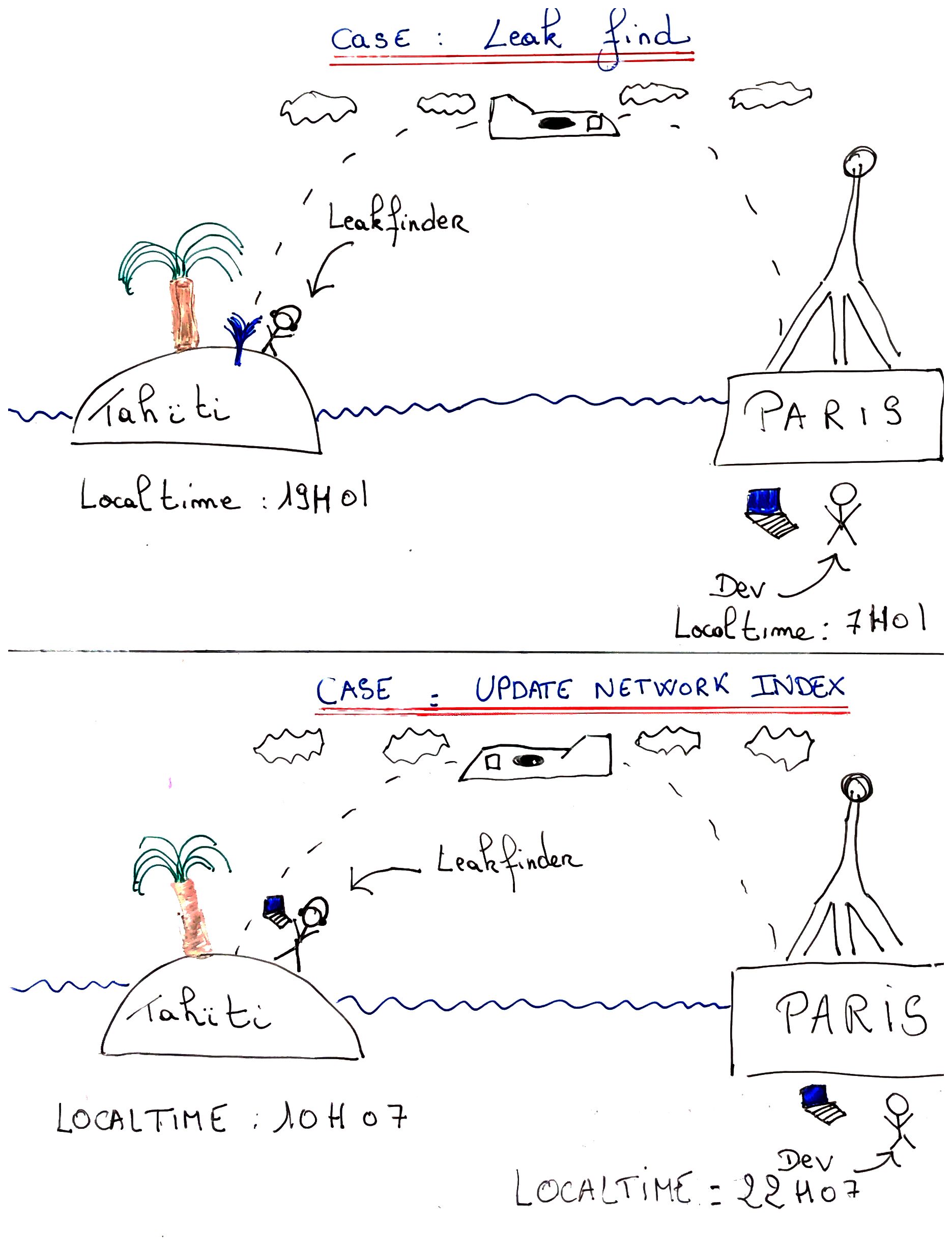 The network index was updated at 22h07 in Paris. So using our system the Leakfinder should vizualize in tahiti that the index was updated at 10h07 (and not 22h07). Because the leakfinder don't give a shit about the hour the system was updated in Paris.